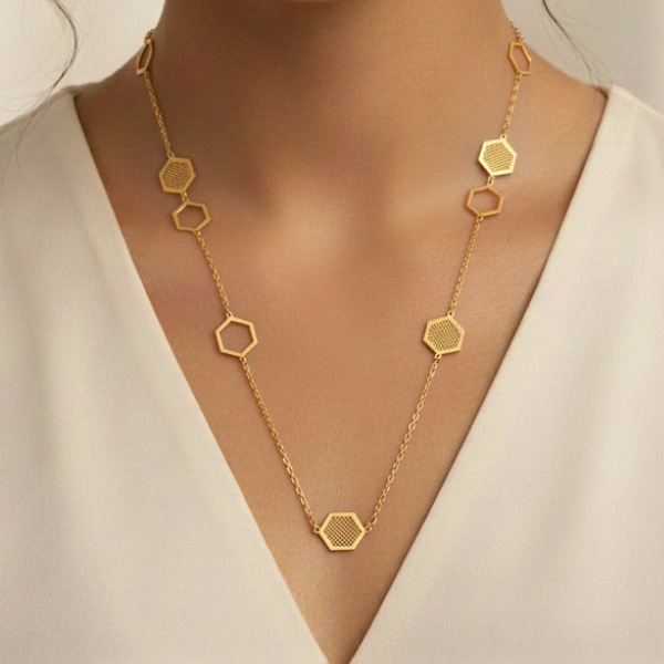 Le Sautoir avec des Carrés se distingue par son design moderne et géométrique, parfait pour celles qui aiment les lignes épurées et le style contemporain.